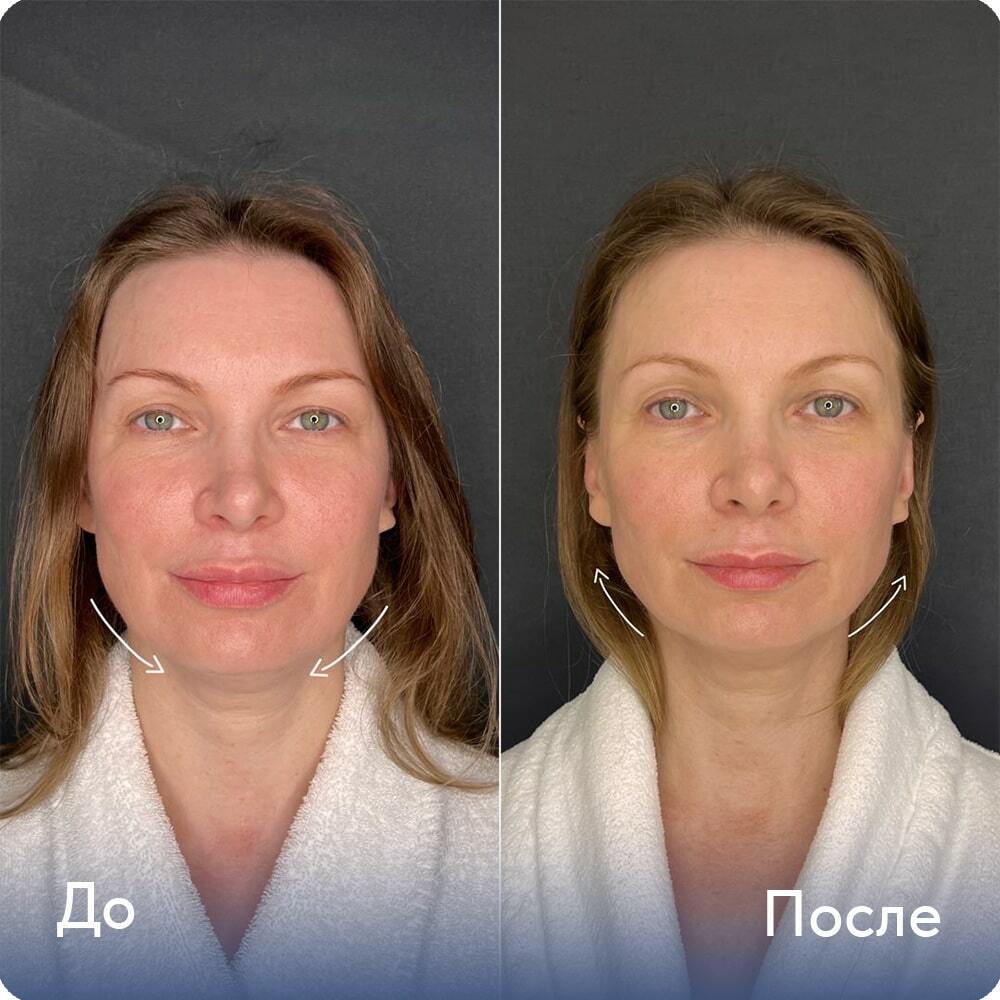 Перемены касаются формы лица – она становится более четкой и скульптурной, уходит расплывчатость и одутловатость. Происходит видимое сокращение количества морщин, снижается скорость старения тканей. Кожный покров становится более свежим и ровным, появляется естественное сияние лица.